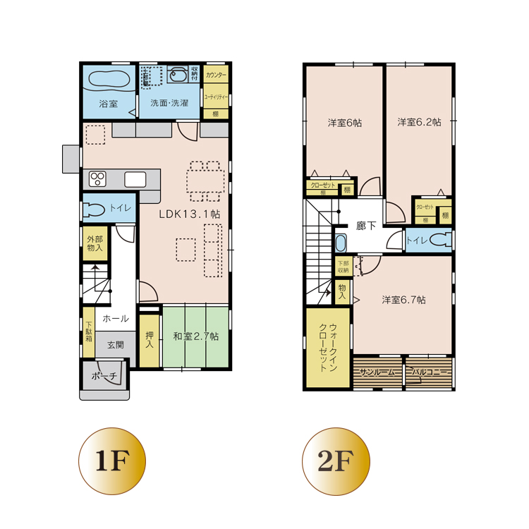 間取り | 1階-LDK13.1,和2.7,トイレ,洗面,風呂,ユーティリティー 2階-洋6.7,洋6.2,洋6,トイレ,洗面,サンルーム,バルコニー |