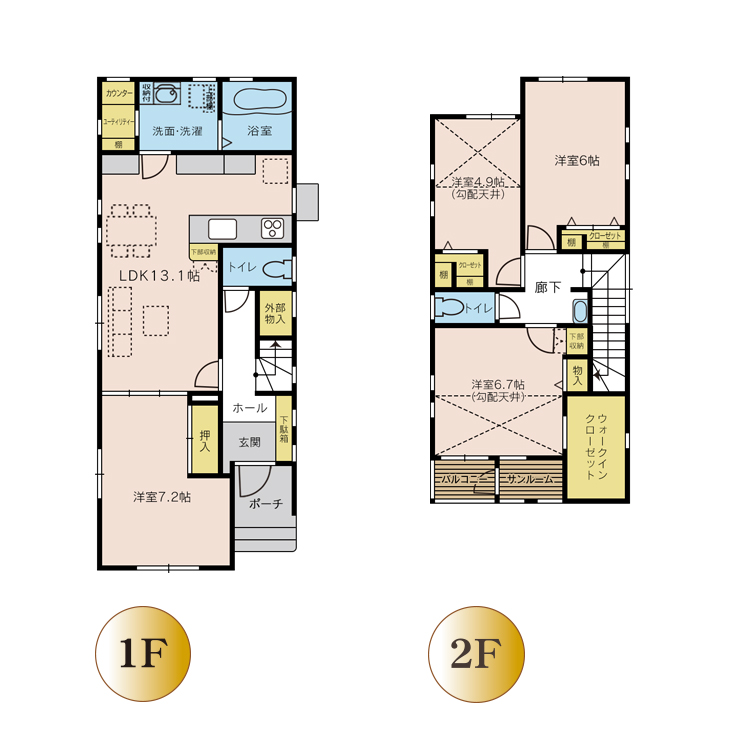| 間取り | 1階-LDK13.1,洋7.2,トイレ,洗面,風呂,ユーティリティー 2階-洋6.7,洋6,洋4.9,トイレ,洗面,サンルーム,バルコニー |
