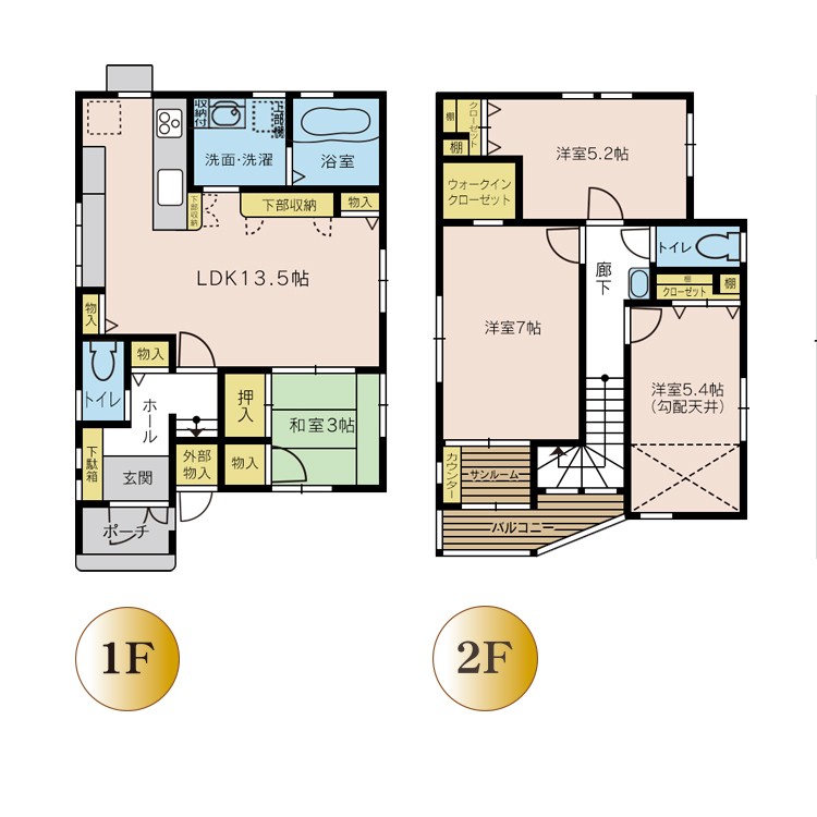 | 間取り | 1階-LDK13.5,和3,トイレ,洗面,風呂 2階-洋7,洋5.4,洋5.2,トイレ,洗面,サンルーム,バルコニー |